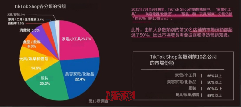 數(shù)據(jù)顯示,7月-9月,TikTok Shop日本站大約80%的銷售額都由前三大熱銷類目貢獻(xiàn),家電及小工具占比23.7%;美妝個(gè)護(hù)占比22.4%(包括美妝類電器);服飾占比20.2%。