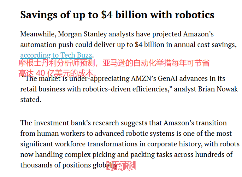 電商平臺與物流企業的集體發力,背后是自動化帶來的巨大價值空間。摩根士丹利在一份研究報告中估算,隨著自動化鋪開并伴隨更低的勞務和履約成本,亞馬遜到2027年可能節省高達40億美元的成本。