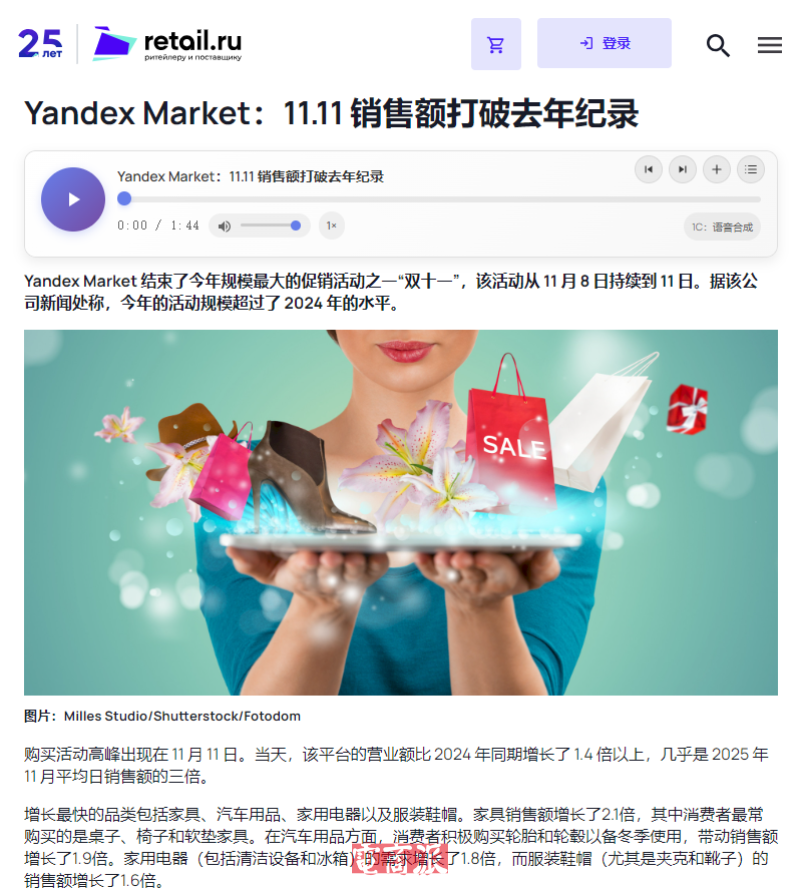 11月18日消息,Yandex Market近日公布今年雙十一的促銷表現,平臺在11月8日-11日的活動規模明顯高于2024年。數據顯示,11月11日當天的銷售額同比增長超過1.4倍,并達到2025年11月平均日銷售額的近三倍,成為此次活動的最高峰。Yandex Market表示,11月28日-12月1日黑色星期五期間還將繼續推出秋季促銷季。