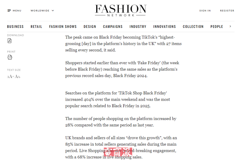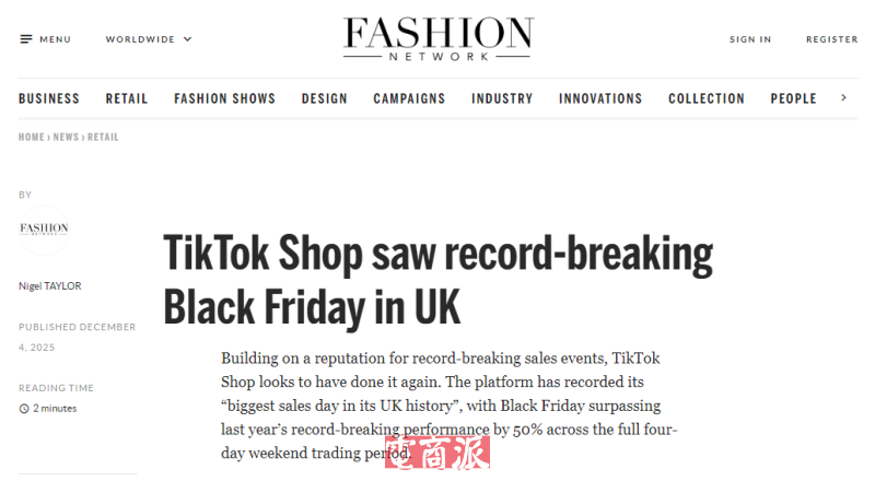 12月5日消息,TikTok Shop英國站在今年黑五期間創下平臺歷史最高銷售紀錄,整體銷售額較去年同期提升50%。高峰期出現在黑色星期五當天,每秒售出27件商品,刷新TikTok Shop在英國的單日銷售紀錄。
