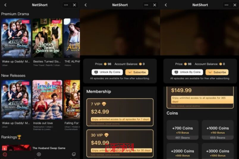 在運行邏輯上,這個短劇板塊也與國內抖音模式極為相似,用戶只需打開感興趣的短劇平臺,無需跳轉應用便能看到各種題材短劇。一般前8-10集是免費,后續再看就要花錢,用戶可選擇花10美元左右解鎖整部劇,或者每月花40-80美元開通會員,解鎖全部內容。