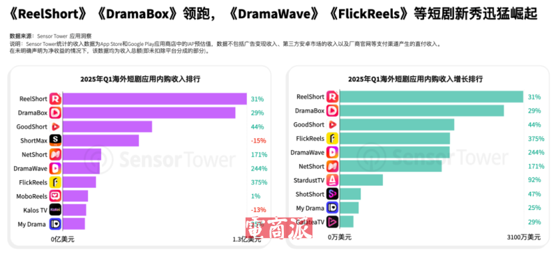 據移動應用情報機構SensorTower的數據,2025年一季度,全球短劇應用內購收入達7億美元,同比增長近4倍。其中,楓葉互動旗下ReelShort、點眾科技旗下DramaBox包攬海外短劇應用收入榜和增長榜冠亞軍,季度內收入分別達1.3億美元和1.2億美元。