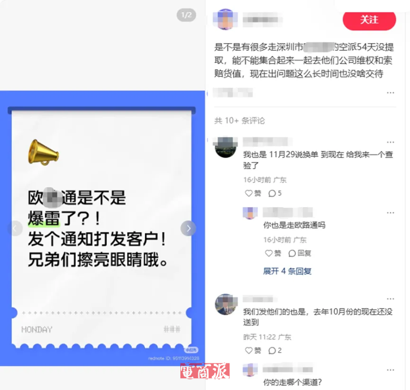 賣家反饋深圳貨代歐*通疑似暴雷 圖源:小紅書